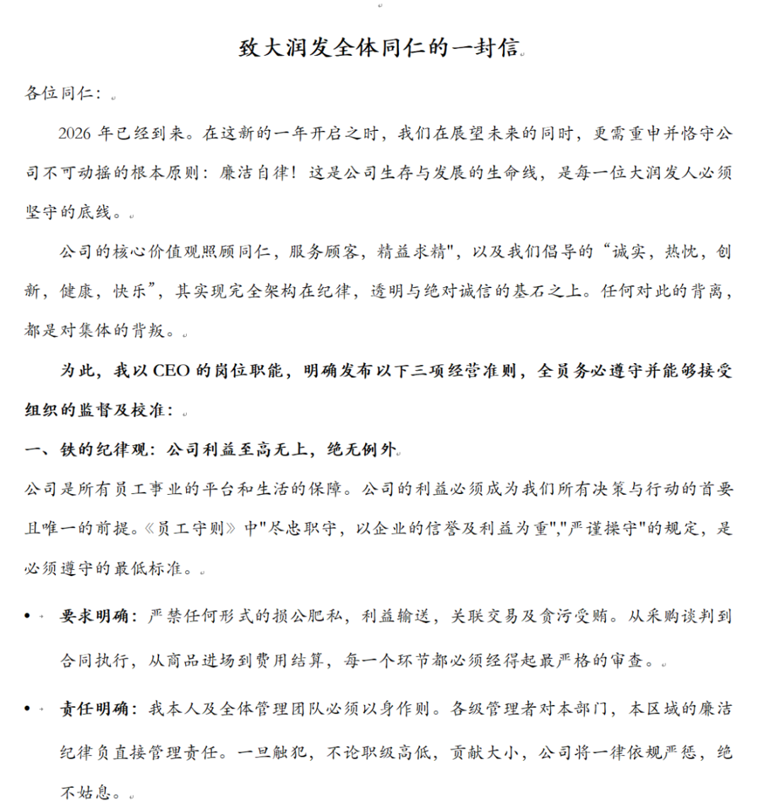 2025年7月,永輝曾發(fā)布了致供應(yīng)商伙伴的一份公開信,高舉反腐大旗;而2026初始,李衛(wèi)平CEO&CMO《致大潤發(fā)全體同仁的一封信》,重申了大潤發(fā)不可動搖的根本原則:廉潔自律,是公司生存與發(fā)展的生命線,是所有大潤發(fā)人必須堅(jiān)守的底線。