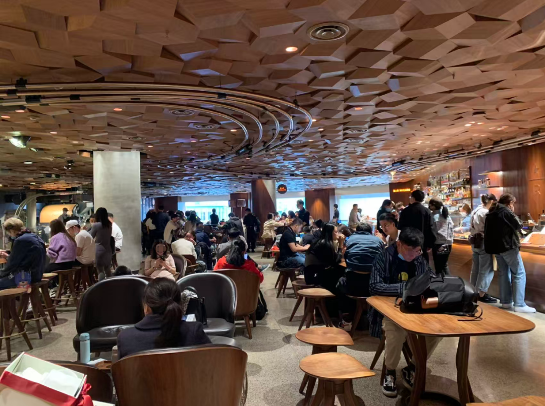 例如星巴克臻選上海烘焙工坊,一樓有甄選烘焙區(qū)、主吧臺、品鑒吧臺、二樓有長吧臺、咖啡圖書館、茶瓦納等。消費者在這里可以看到咖啡生豆,經歷工業(yè)化的烘焙、沖煮,最后成為手中飲品的過程。