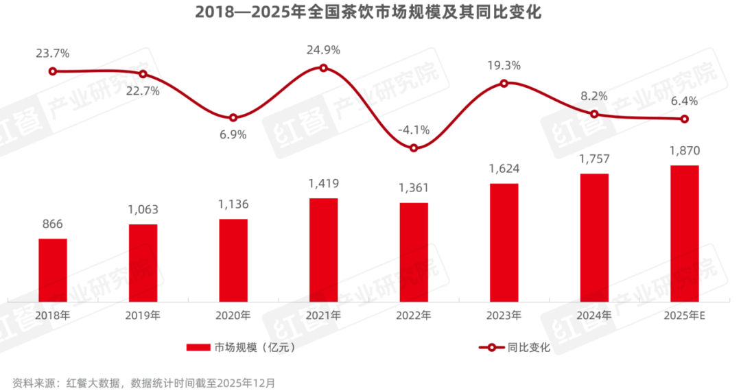 隨著茶飲消費(fèi)需求的持續(xù)釋放,茶飲市場(chǎng)規(guī)模逐步增長(zhǎng)。據(jù)紅餐產(chǎn)業(yè)研究院測(cè)算,2025年全國(guó)茶飲市場(chǎng)規(guī)模預(yù)計(jì)同比增長(zhǎng)6.4%,達(dá)到1870億元。