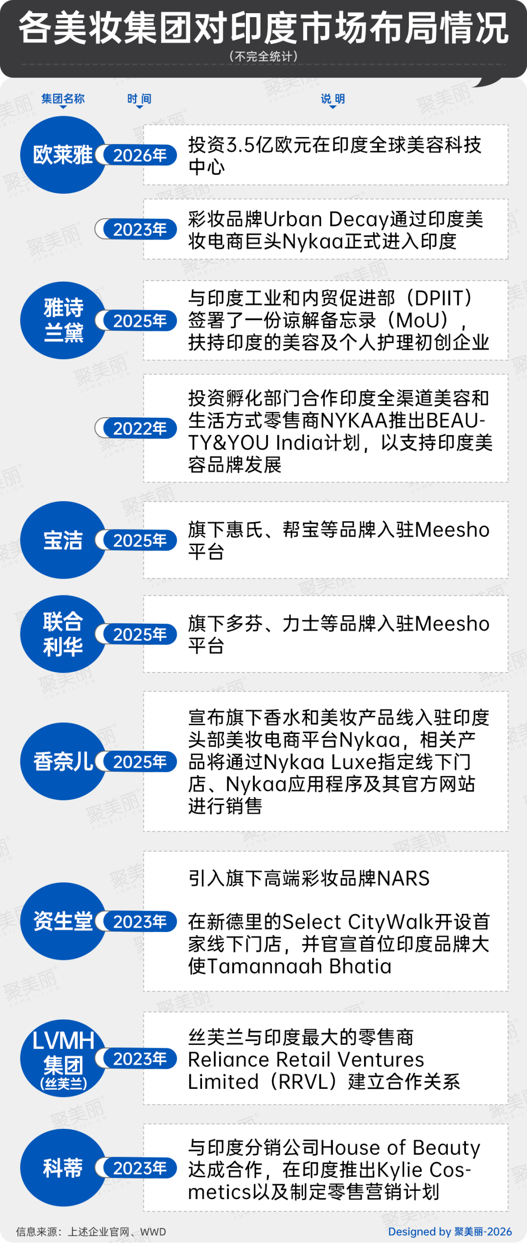 據(jù)了解,截至2023年,歐萊雅已引入歐萊雅巴黎、美寶蓮紐約等在內(nèi)的15個美妝及個護品牌進行培育,并在印度設(shè)立高級研究中心,負責(zé)美發(fā)、護膚和彩妝研發(fā)需求;2025年還領(lǐng)投了印度護膚品牌Deconstruct的A輪融資。一系列動作印證了其對印度市場的持續(xù)加碼。
