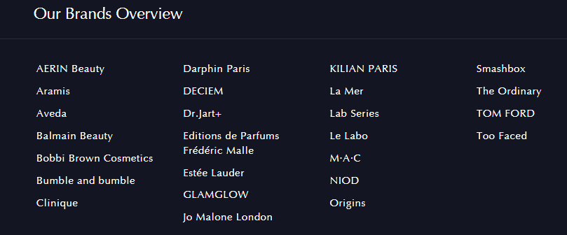 雅詩(shī)蘭黛創(chuàng)立于1946年,是全球領(lǐng)先的高端美妝集團(tuán),旗下?lián)碛醒旁?shī)蘭黛、海藍(lán)之謎、倩碧、M.A.C等多個(gè)知名品牌,業(yè)務(wù)覆蓋護(hù)膚、彩妝、香水及護(hù)發(fā)等領(lǐng)域,以創(chuàng)新科技與高端品質(zhì)著稱(chēng),行銷(xiāo)全球150多個(gè)國(guó)家和地區(qū)。