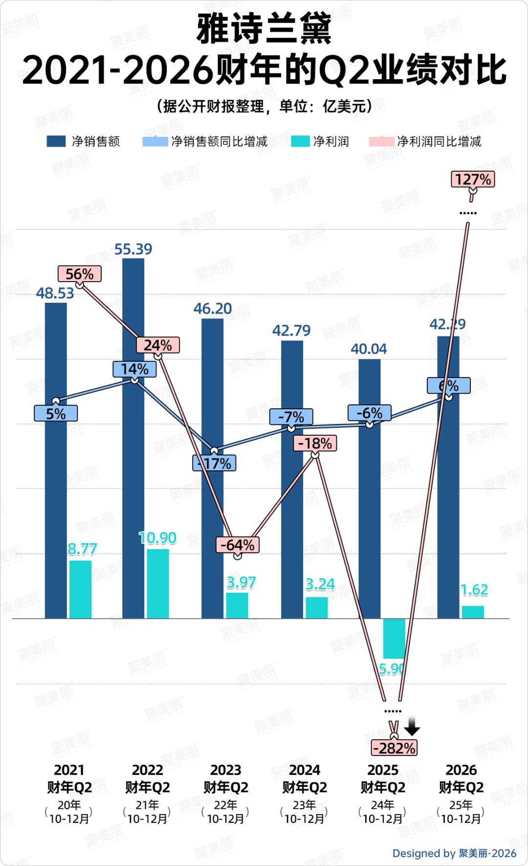 從上述數(shù)據(jù)來(lái)看,雅詩(shī)蘭黛公司凈銷(xiāo)售額、凈利潤(rùn)雙增長(zhǎng)的明朗局勢(shì)已經(jīng)了然,尤其是2026財(cái)年Q2及上半年均實(shí)現(xiàn)扭虧為盈。