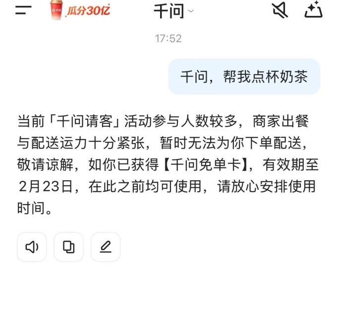 有網(wǎng)友算了一筆賬,活動(dòng)期間,每個(gè)人可以領(lǐng)取21張無(wú)門檻的25元免單卡,相當(dāng)于525塊錢。如果一家6口人參與千問(wèn)免單活動(dòng),5分鐘就可獲得275元的無(wú)門檻免單卡,如果用來(lái)點(diǎn)單價(jià)較低的蜜雪冰城檸檬茶,可以免費(fèi)喝84杯。該活動(dòng)帶來(lái)的高訂單量,直接影響了整個(gè)行業(yè)的工作節(jié)奏。
