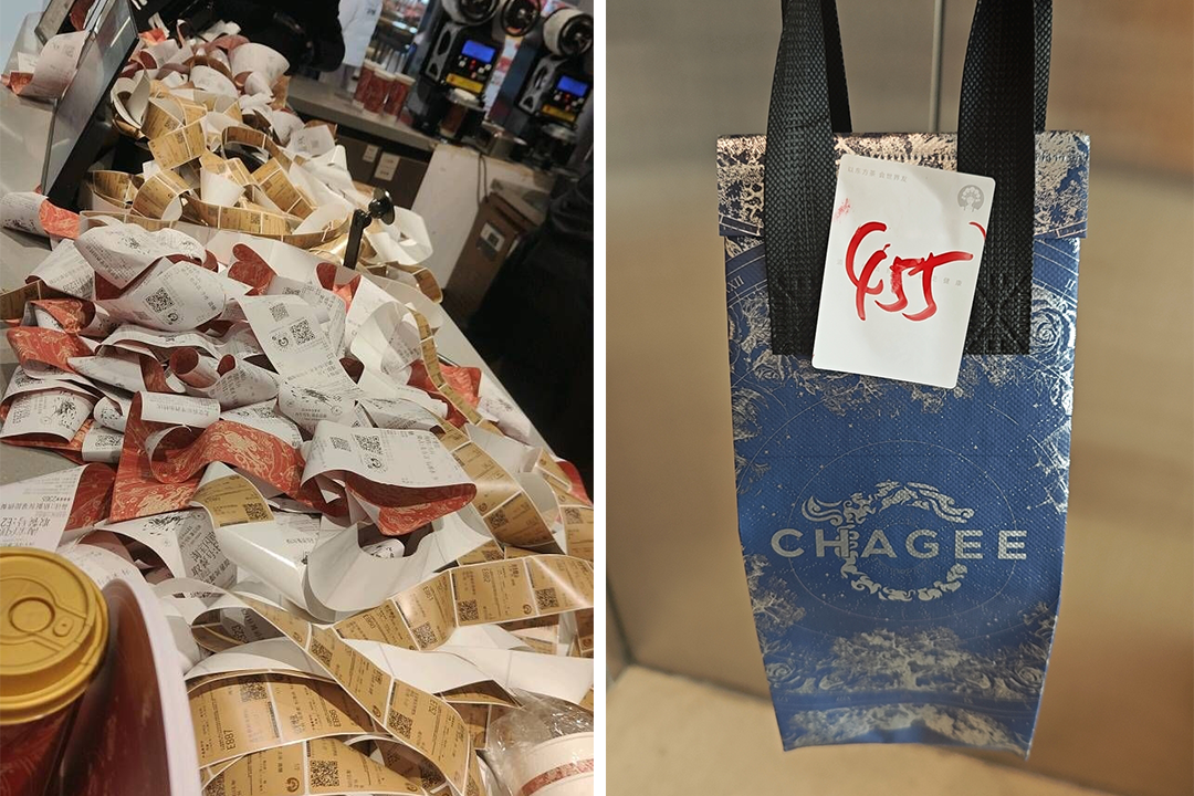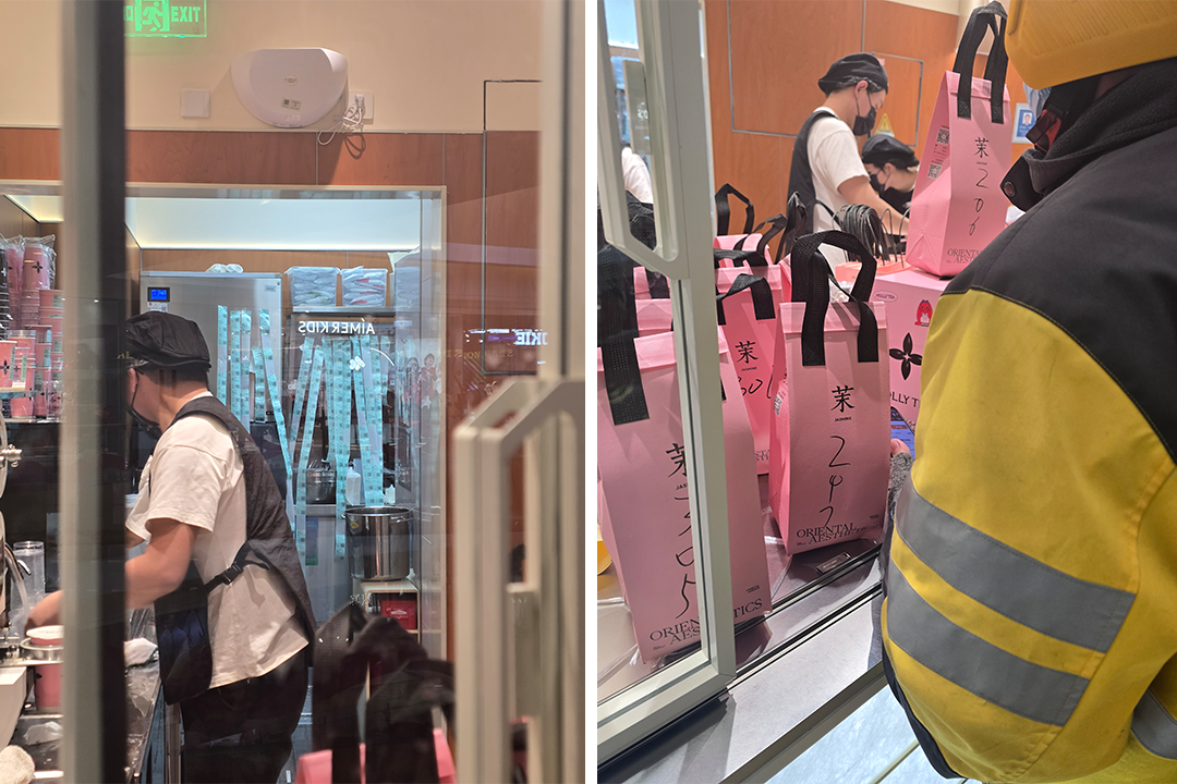 附近商場里的茉莉奶白,店里店員正來回穿梭,背后的小票像瀑布一樣,做好的奶茶堆在一起,包裝上用馬克筆做了單號標(biāo)記方便騎手取餐。