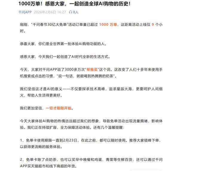 一時間,社交平臺上似乎人人都在買奶茶,一度把千問干崩了,把奶茶店也干崩了。下午16時27分,千問通過公眾號發(fā)布戰(zhàn)報表示:千問春節(jié)30億大免單”上線9小時,活動訂單量已超過1000萬單。