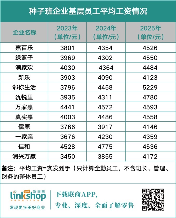 12家種子班企業(yè)的基層員工平均實發(fā)工資已連續(xù)三年增長,2025年全部達到或超過了零售行業(yè)健康企業(yè)的收入標準。例如,鄰你生活的員工平均工資從2023年的3796元增長到2025年的5229元;嘉百樂不僅實現(xiàn)了工資的大幅提升,更將“50%利潤分給團隊”寫入公司章程,2025累計利潤分發(fā)約150萬元,讓員工共享發(fā)展成果。