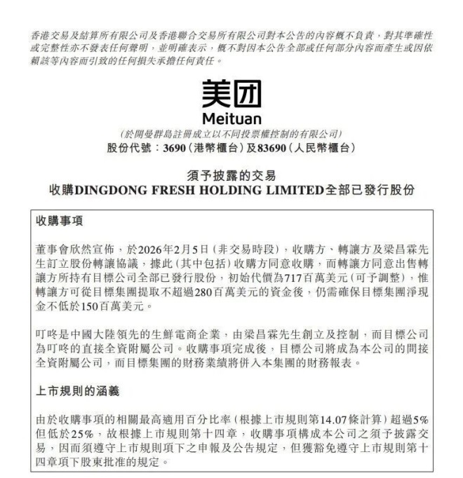 2月5日,美團發(fā)布上市公司公告,以7.17億美元(約合人民幣50億元)的初始價格,收購叮咚買菜全部股份及其中國業(yè)務(wù)。收購?fù)瓿珊螅_速I菜將成為美團間接全資附屬公司,其財務(wù)業(yè)績將并入美團報表。