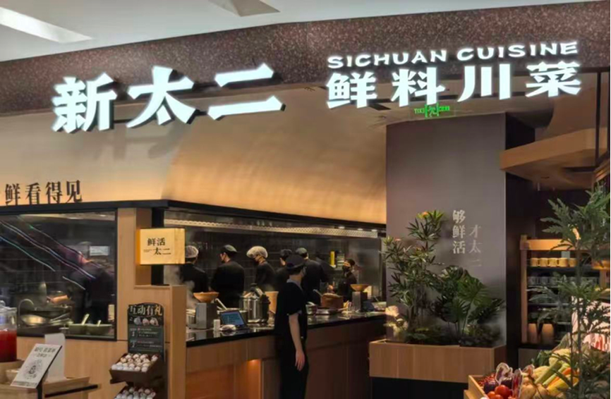 太二的變化就更大了,直接升級(jí)為川菜館。廣州、深圳等市場(chǎng)陸續(xù)將幾家門店招牌名改為“新太二·鮮料川菜”,口號(hào)也變成了“用鮮活食材,做鮮料川菜”,在門店承諾活魚每日到店、牛肉鮮切現(xiàn)做以及鮮雞每日送達(dá)。