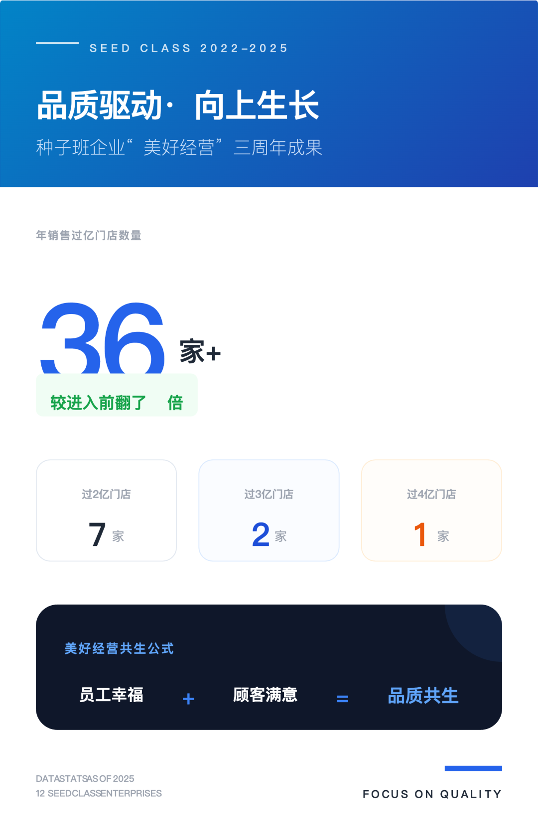 這三年來,種子班企業(yè)始終踐行美好經(jīng)營理念,不斷壓縮門店規(guī)模、聚焦品質(zhì)發(fā)展,“億元店”(指年銷售額破億元大關(guān)的店)數(shù)量持續(xù)增加。截至2025年,12家種子班企業(yè)中,銷售過1億的門店超過36家,較進(jìn)入種子班前翻了三倍;其中,過2億門店7家、過3億門店2家、過4億門店1家。這一成果再次印證:?jiǎn)T工幸福、顧客滿意與門店品質(zhì)提升,完全可以實(shí)現(xiàn)和諧共生、協(xié)同發(fā)展。