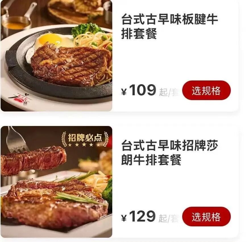 點(diǎn)單小程序顯示,呷牛排推出的14款牛排套餐里,就包括了在臺(tái)灣餐廳和夜市里比較常見(jiàn)的臺(tái)式古早味板腱牛排套餐、臺(tái)式古早味招牌沙朗牛排套餐。