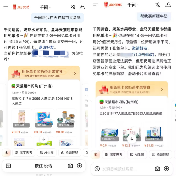 2月7日,天貓超市成為首個(gè)覆蓋全國(guó)的AI超市,用戶只需對(duì)千問(wèn)APP說(shuō)一句“幫我在天貓超市買洗衣液”、“幫我在天貓超市買箱紙巾”,千問(wèn)就可以從天貓超市的海量商品中挑出適合的商品,在用戶下單后即時(shí)配送。據(jù)了解,千問(wèn)春節(jié)「免單卡」活動(dòng)延續(xù)到2月28日,春節(jié)假期,天貓超市不僅能一句話送到家,還能享受25元免單優(yōu)惠。
