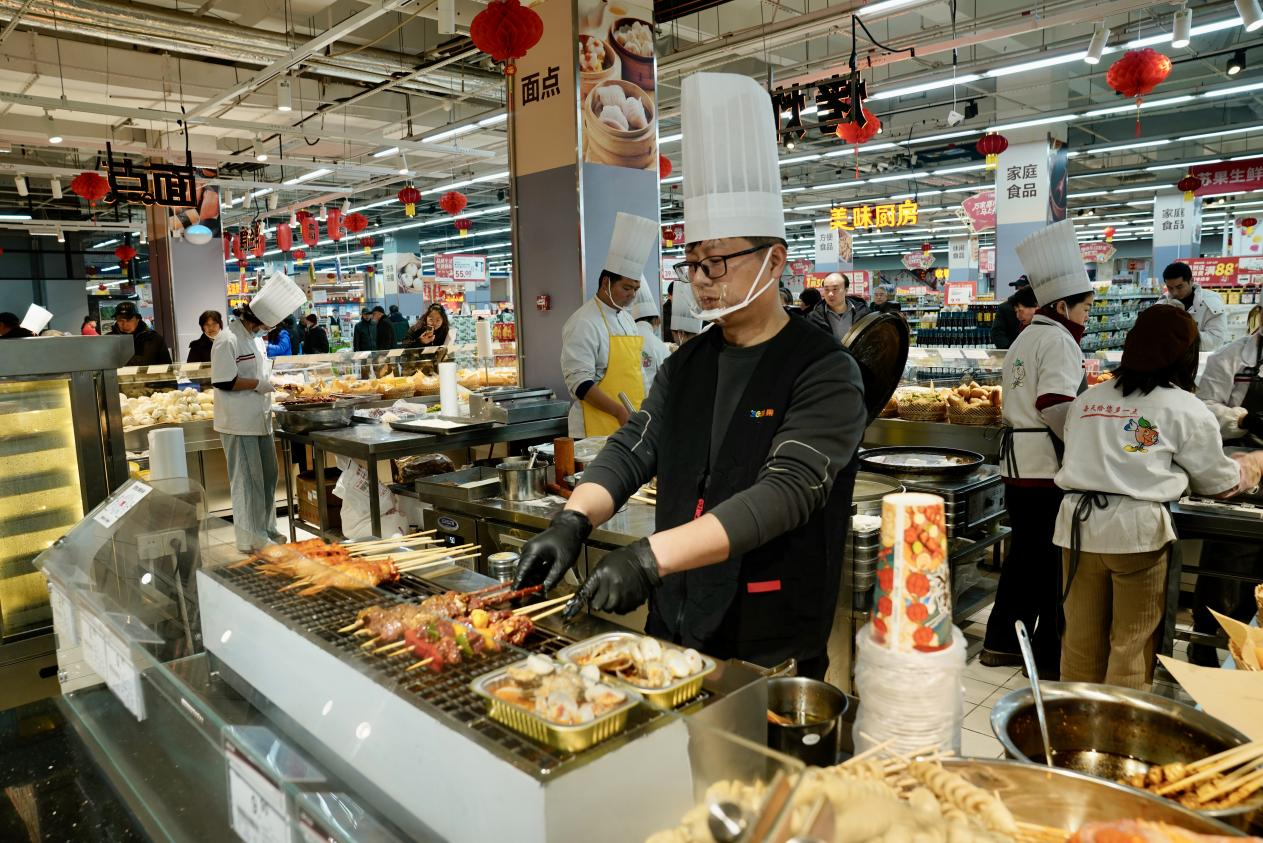 以醬鹵區(qū)為例,該區(qū)域天南地北的風味輪番登場。中式區(qū)域的涼拌鹵味色澤誘人,醬牛肉、無骨鳳爪、醬大骨,每一款都是佐餐下酒的不二之選;日式檔口精致吸睛,現(xiàn)點現(xiàn)切的三文魚鮮美嫩滑,用料扎實的壽司一口一個超滿足。現(xiàn)烤現(xiàn)串的羊肉串、牛肉串滋滋冒油,撒上一把孜然辣椒面,肉香混著炭火香,讓路過的顧客忍不住停下腳步;外酥里嫩的醬香餅、肉蛋堡剛出爐就被搶空。這份觸手可及的溫暖與撲面而來的煙火氣,正將超市從單純的購物場所,轉變?yōu)樯鐓^(qū)生活的新節(jié)點。
