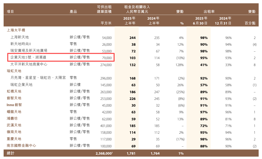 據(jù)瑞安房地產(chǎn)財(cái)報(bào)顯示,疑似涉及此次交易的企業(yè)天地5號(hào)、湖濱道2024年全年租金收入約2.34億元,出租率錄得93%。而在2025年上半年,該項(xiàng)目租金收入為1.03億元,出租率提升至95%高位。