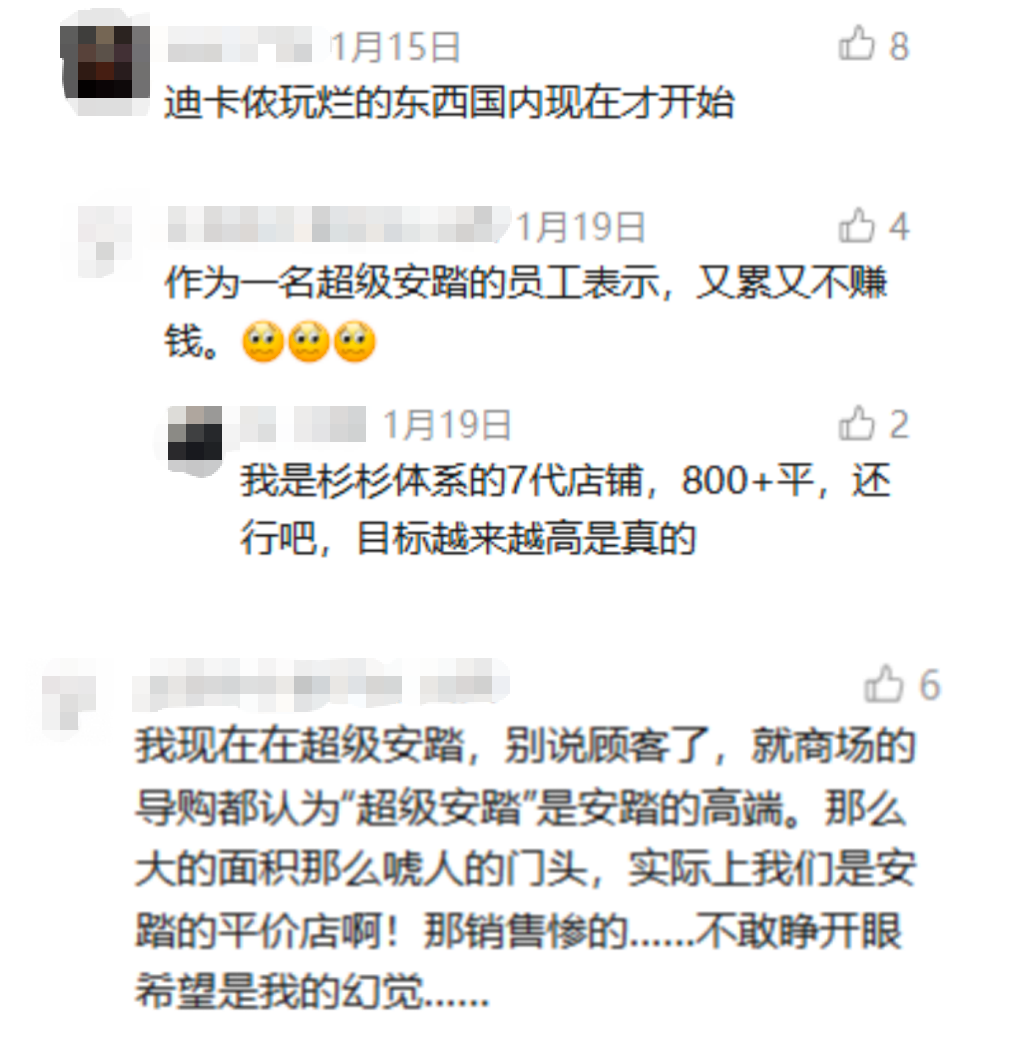 也有自稱品牌員工的網(wǎng)友表示,雖然產(chǎn)品零售價低于常規(guī)店,但超級安踏設(shè)定了更高的營收目標(biāo),經(jīng)營達(dá)標(biāo)都略顯困難。