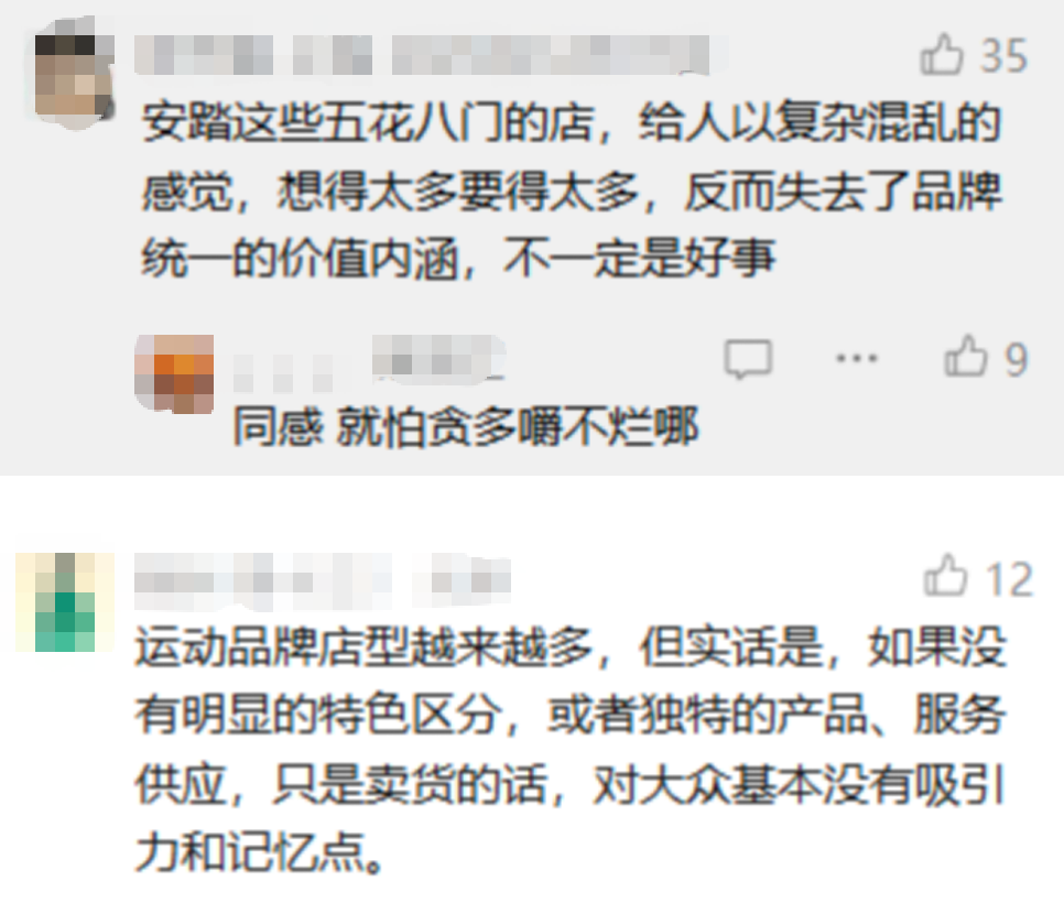 有消費者認(rèn)為,ANTA安踏“五花八門的店”給人以復(fù)雜混亂的感覺,想要的太多反而失去品牌統(tǒng)一的價值內(nèi)涵;但也有業(yè)內(nèi)人士指出,ANTA安踏或仍在試錯階段,失敗的可暫時封存,一旦出現(xiàn)爆款便可批量復(fù)制,以多元化去應(yīng)對市場。