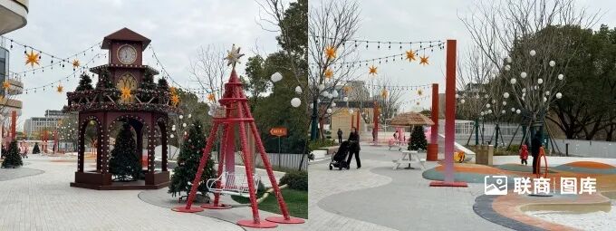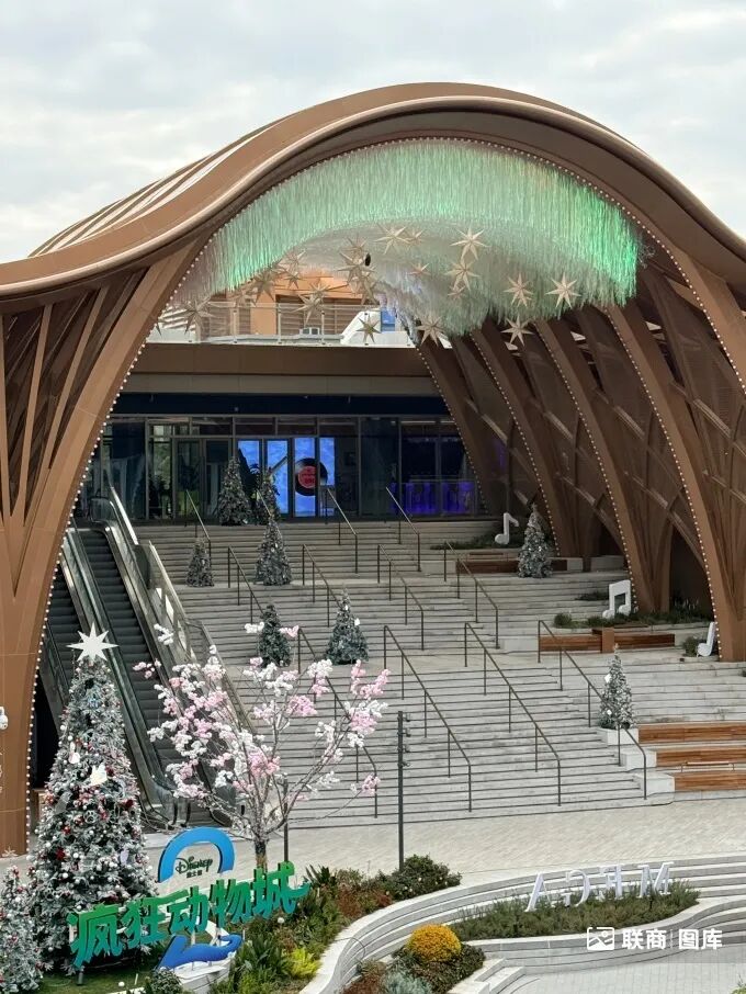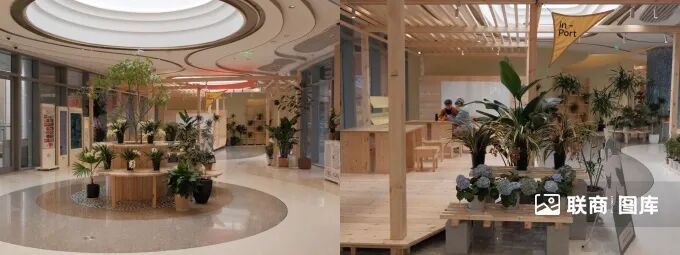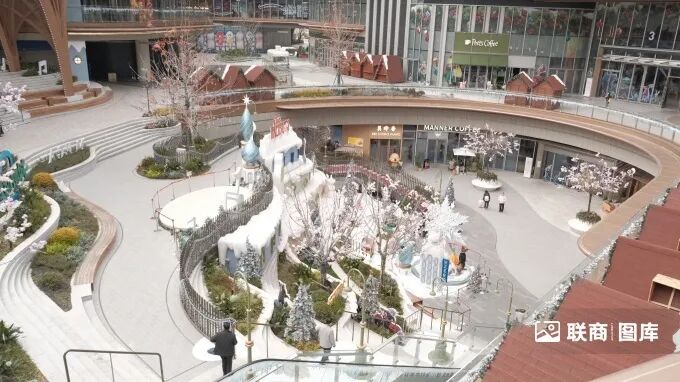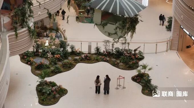 2)街區(qū)與購物中心以環(huán)形下沉式廣場相連接,項(xiàng)目方將其定義為“樂游灣”,F(xiàn)場可以看到,目前下沉式廣場的美陳是冰雪城堡,與當(dāng)下的冬季“雙節(jié)營銷”契合;而巨大的拱門穹頂下,大面積的階梯設(shè)計(jì)不僅能有效連接地下與地上空間,也極大提升了游逛性。同時(shí),環(huán)形廊道也將二樓幾個(gè)不同的block有效連接,配合綠植、花卉、藤架等裝飾,打造出了舒適的氛圍感。