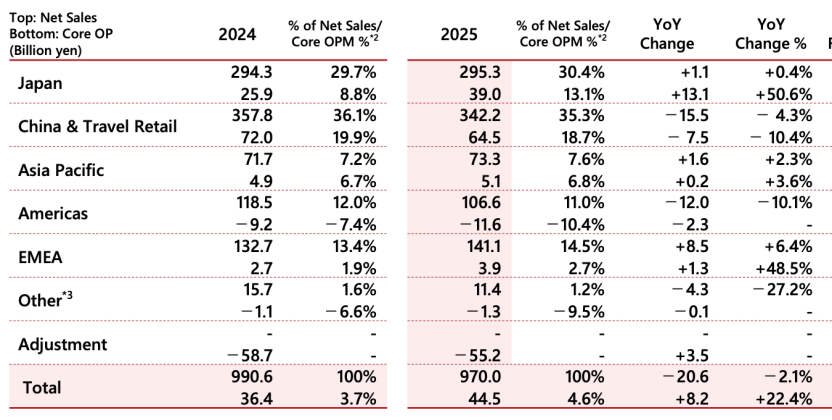 2025年資生堂的日本區(qū)銷(xiāo)售額微增0.4%、中國(guó)及旅游零售市場(chǎng)下跌4.3%、亞太區(qū)增長(zhǎng)2.3%、歐非中東增長(zhǎng)6.4%,唯有美洲地區(qū)下泄10.1%。美洲市場(chǎng)還是唯一一個(gè)核心營(yíng)業(yè)利潤(rùn)虧損的地區(qū),2025年虧損115.6億日元(約合人民幣5.21億元)。
