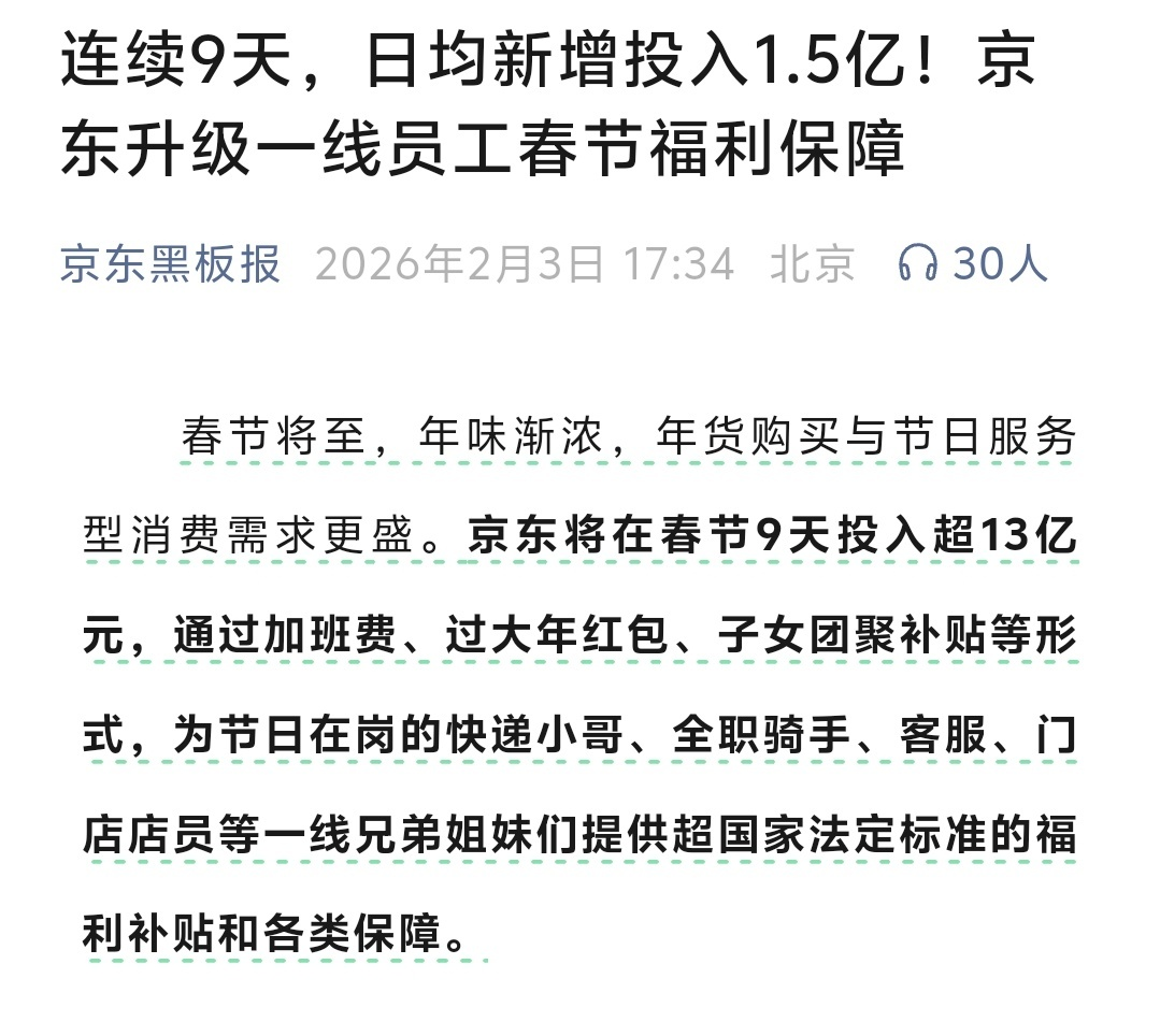 就在不久前,京東還宣布,將在為期九天的春節(jié)假期期間投入超過13億元,專門用于保障一線在崗員工的福利。不管是對用戶的實在讓利,還是對員工的貼心保障,都能看出京東的經營底色。