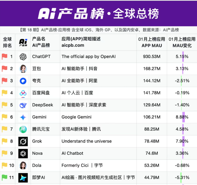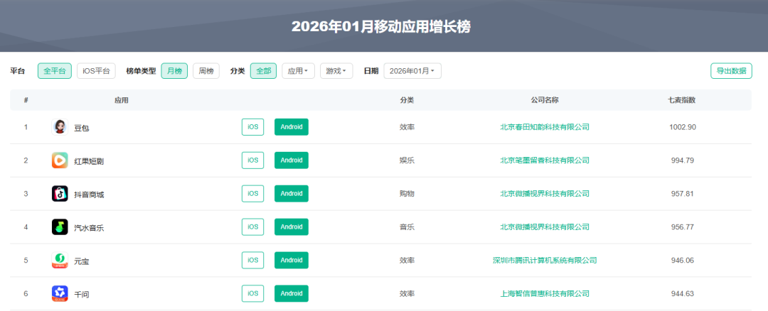始于2014年的春節(jié)紅包營銷,之所以歷經(jīng)多年仍被大廠沿用,除契合春節(jié)消費(fèi)場景外,其強(qiáng)用戶感知、高社交裂變的屬性,使其成為當(dāng)前AI行業(yè)高獲客成本背景下的最優(yōu)拉新路徑之一。例如,豆包、元寶、千問在2026年1月移動(dòng)應(yīng)用增長榜中,分別位列TOP1、TOP5、TOP6。