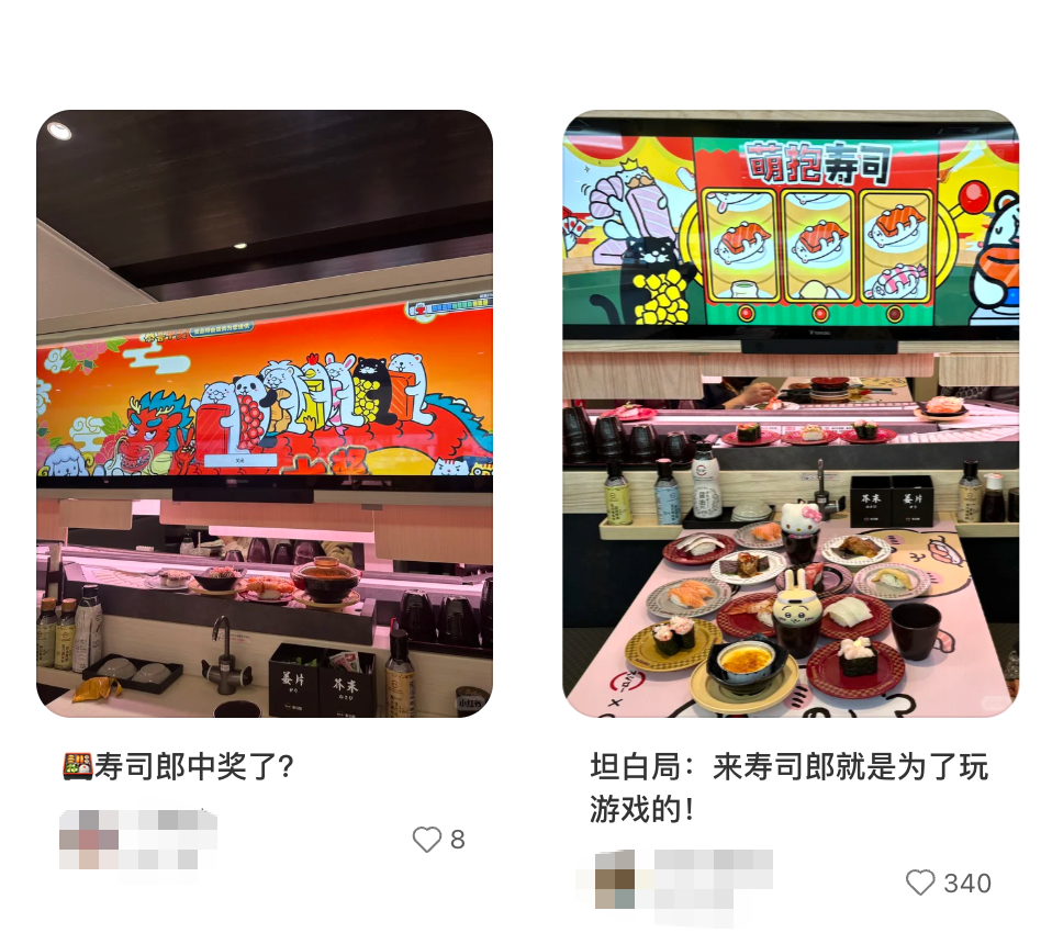 此外,壽司郎在華北和華東新門店引入了1.5米點單大屏,圍繞著大屏展開的點餐、抽獎、游戲環(huán)節(jié),也進一步將用餐過程娛樂化。
