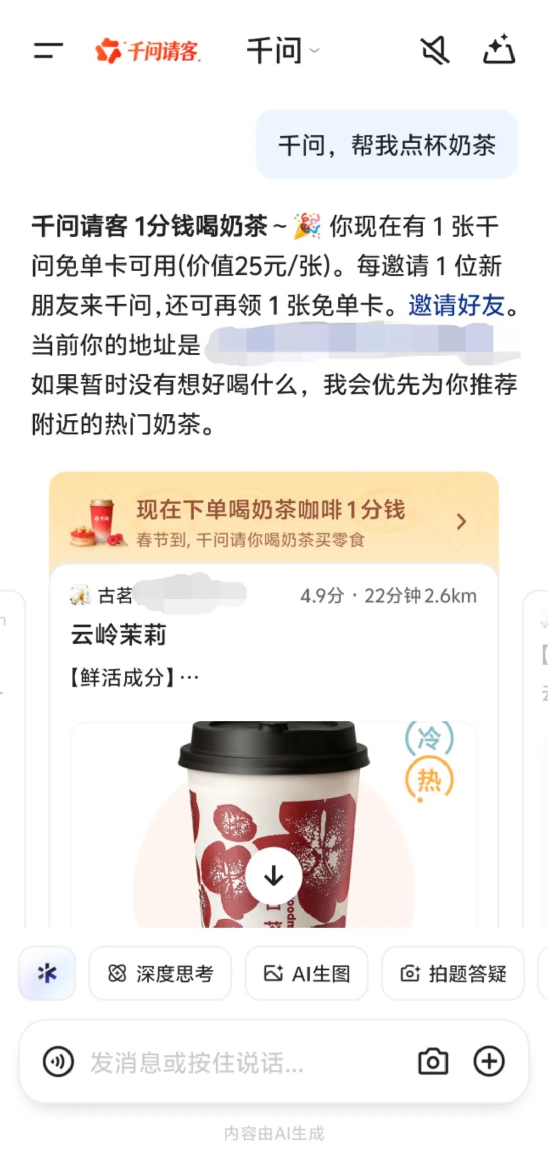 以千問春節(jié)活動為例,阿里利用幾乎零門檻的“免費喝奶茶”吸引用戶首次使用。一杯奶茶二三十元,決策成本極低,體驗門檻也極低,用戶只需要說一句“千問,幫我點杯奶茶”,即可完成點單。