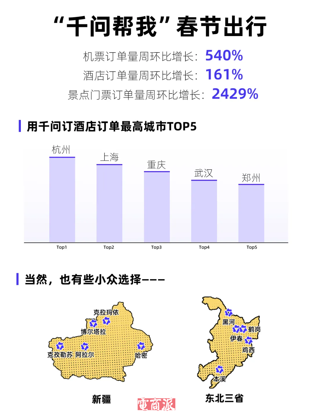 數(shù)據(jù)顯示,春節(jié)期間千問上的機票訂單周環(huán)比增長540%,酒店訂單量周環(huán)比增長161%,景點門票訂單量環(huán)比增長2429%。