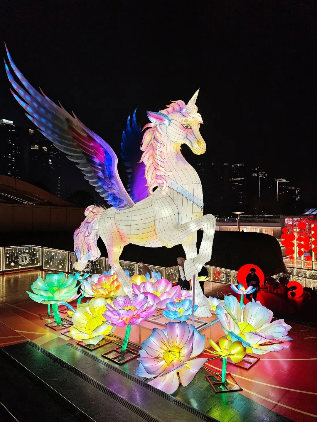 在大慈寺照壁前的漫廣場(chǎng),是巨型新春裝置「騏驥織光·福馬迎春」,兼具視覺(jué)震撼、豐富細(xì)節(jié)、互動(dòng)氛圍與迎春年味。