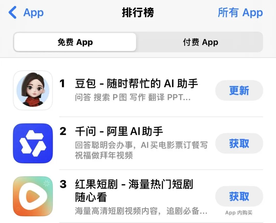 從最新App Store免費排行榜看,去年9月月活就達1.72億的字節(jié)豆包依然排在第一位。它的領跑,源于“技術+情感”的雙重卡位。