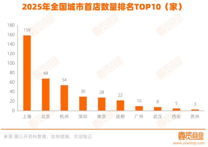 上海持續(xù)保持領(lǐng)先地位,開出159家全國首店;北京的首店數(shù)量增長至68家,超過杭州躍居第二;杭州則以54家全國首店排名第三;三城共開設(shè)首店311家,占首店總量66.90%,牢牢占主導(dǎo)地位。