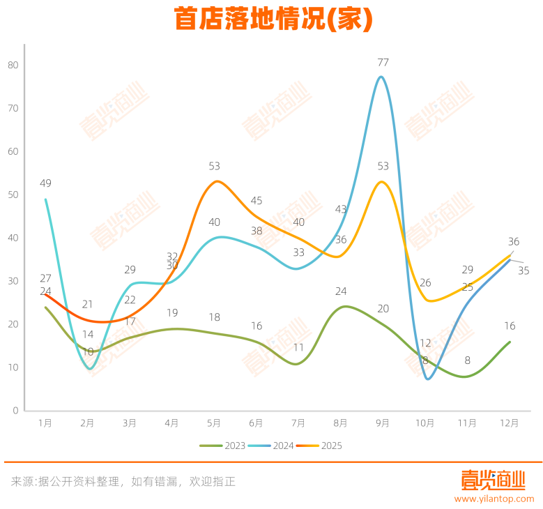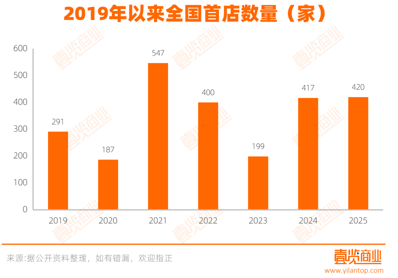 據(jù)壹覽商業(yè)不完全統(tǒng)計(jì),2025年,全國36個(gè)城市至少開出420家首店,同比增長7.19%。