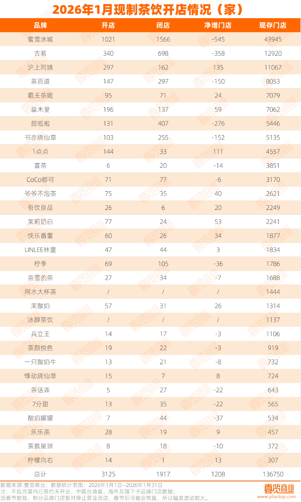 2026年開年,現制茶飲品牌延續(xù)擴張態(tài)勢。壹覽商業(yè)數據顯示,31個現制茶飲品牌合計現有門店總量13.68萬家,單月新開3125家、關閉1917家,凈增長1208家。
