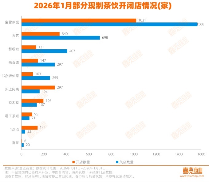 1月現制茶飲:開店3125家,關店1917家