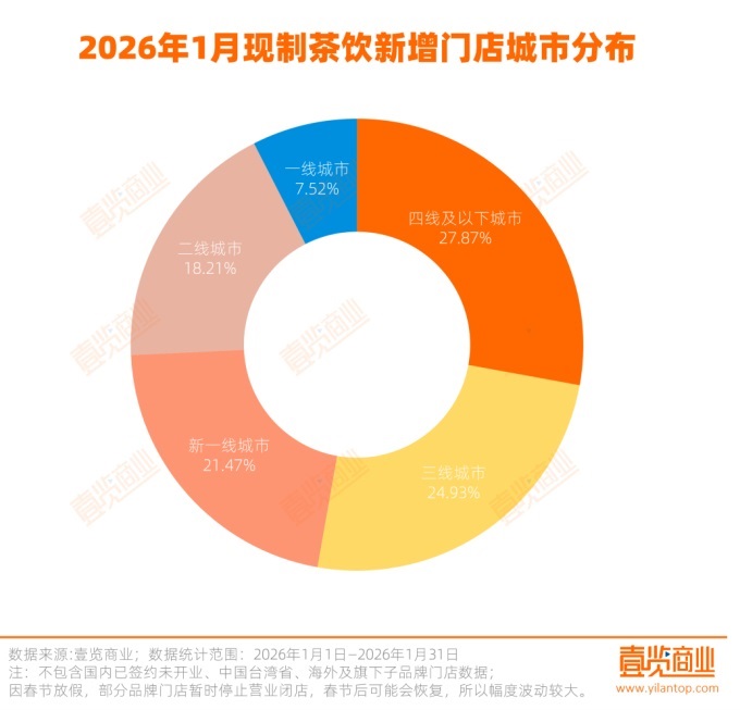 從新增門店的城市分布來看,現制茶飲的門店增長重心持續(xù)下沉,其中四線及以下城市1月新增871家門店,占新增總量的27.87%;三線城市表現同樣突出,新增779家門店,占比24.93%;相較而言,高線城市增長緩慢,一線城市僅新增235家門店,占比最少,為7.52%。