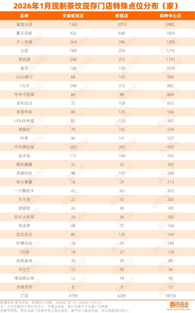 在交通樞紐點位,現制茶飲品牌在此布局的態(tài)度較為審慎,除蜜雪冰城有1342家門店外,僅霸王茶姬、滬上阿姨、古茗、茶百道、喜茶、1點點、書亦燒仙草、益禾堂在此分布超過100家門店。