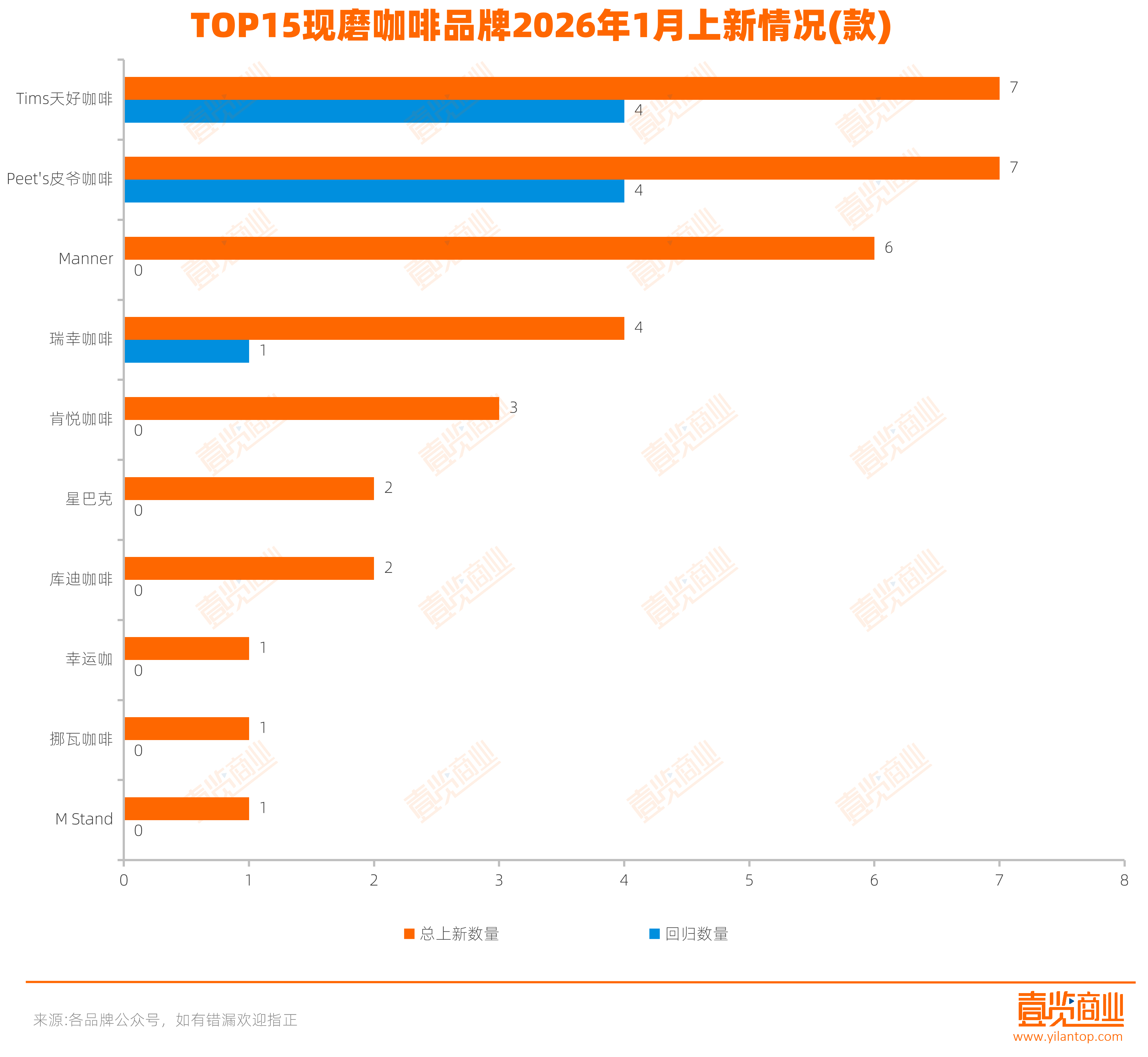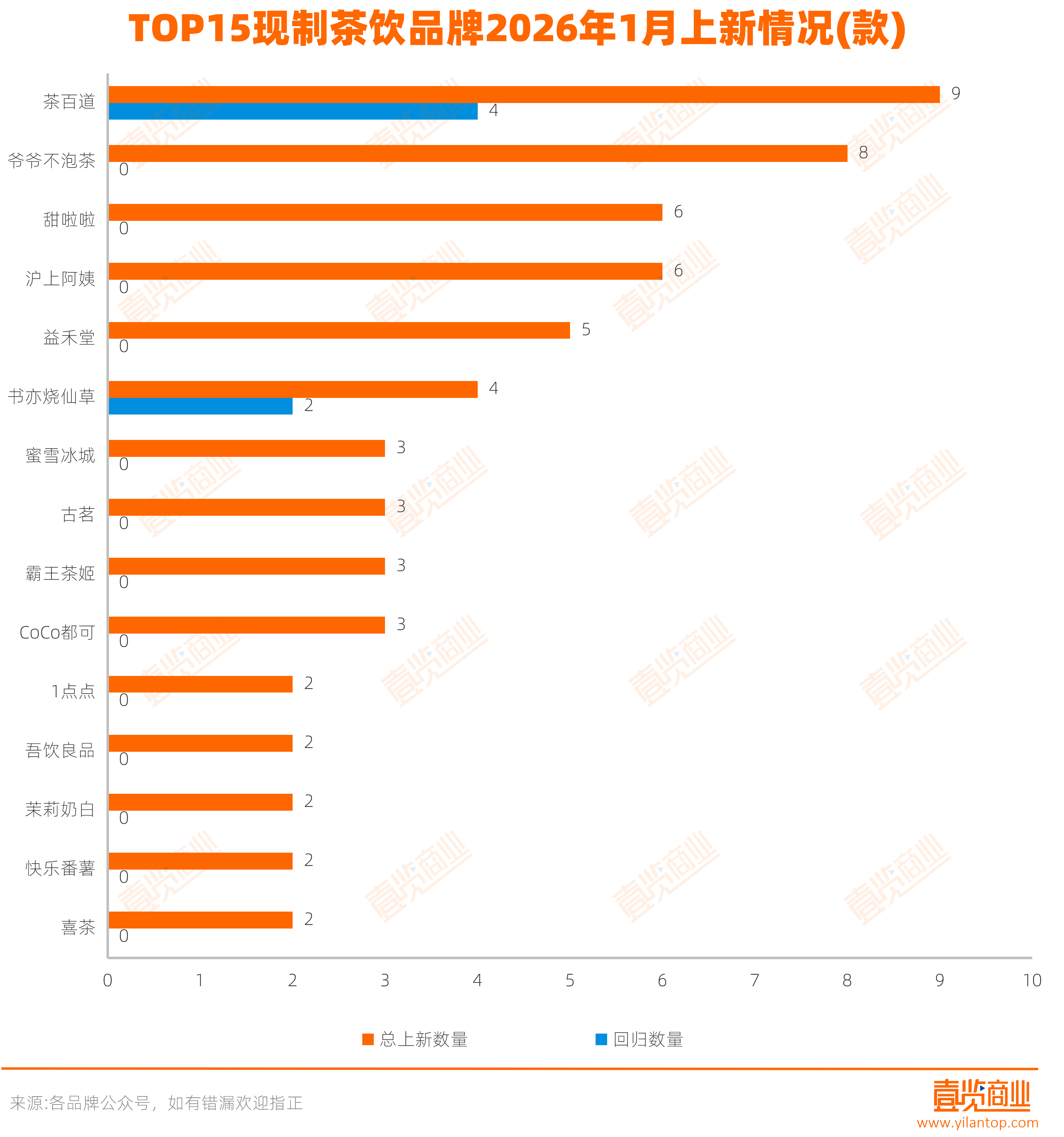壹覽商業(yè)數(shù)據(jù)顯示,2026年1月,全國門店數(shù)量排名前十五的茶咖品牌合計推出94款新品。其中,現(xiàn)制茶飲品牌共上新60款產(chǎn)品,包含6款回歸產(chǎn)品;現(xiàn)磨咖啡品牌上新34款產(chǎn)品,包含9款回歸產(chǎn)品。