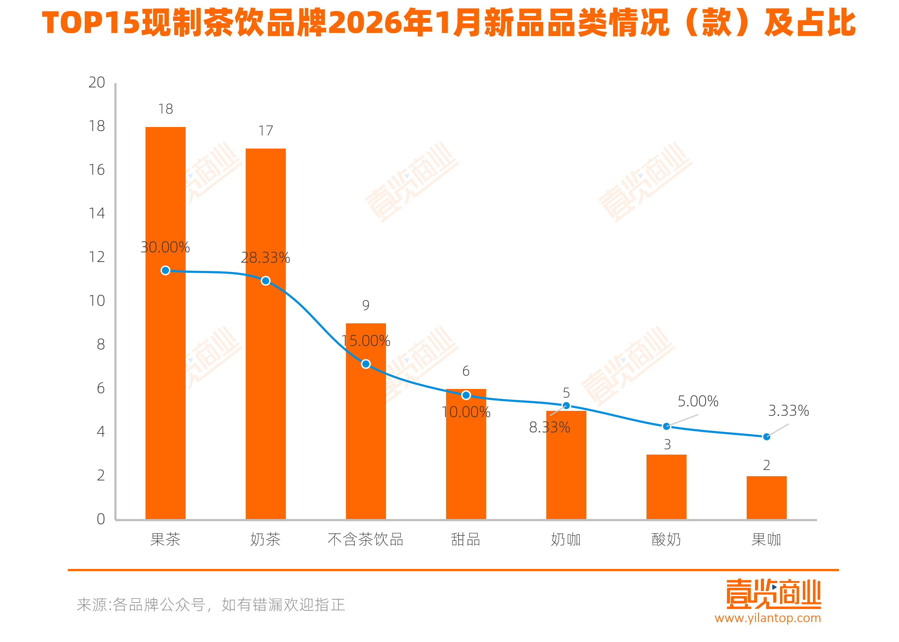 現(xiàn)制茶飲品牌方面,1月共上新18款果茶,占比30.00%;奶茶是上新的另一主力,共上新17款占比28.33%;不含茶飲品上新9款,占比15.00%;甜品、奶咖、酸奶、果咖亦有上新,表明了現(xiàn)制茶飲品牌在多品類布局的不斷探索。