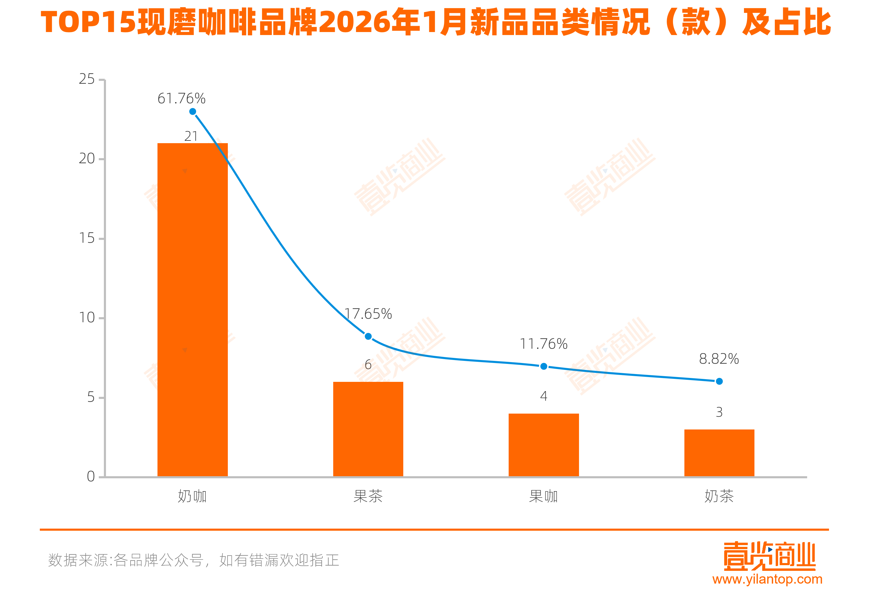 現(xiàn)磨咖啡品牌方面,奶咖成為上新的絕對主流,共上新21款,占比61.76%,果茶上新6款占比17.65%;果咖和奶茶分別上新4款和3款,表明現(xiàn)磨咖啡品牌也在積極拓展風(fēng)味與品類的邊界。