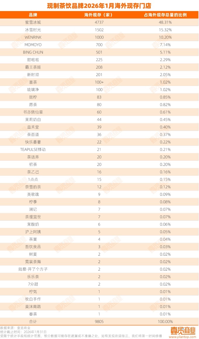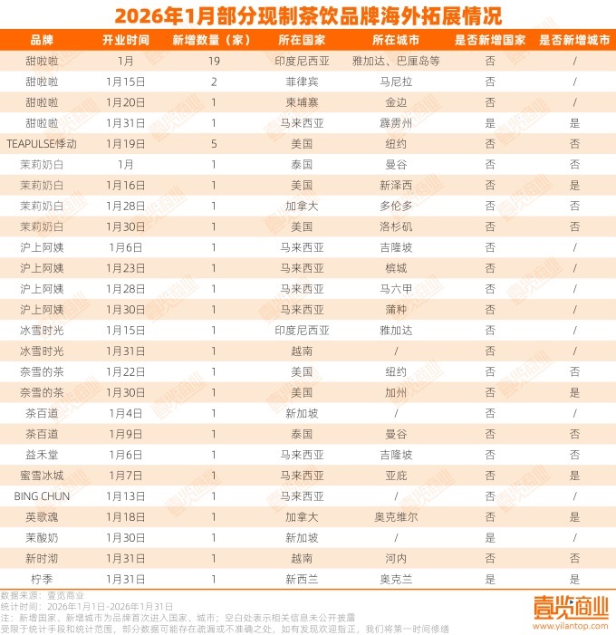 壹覽商業(yè)數(shù)據(jù)顯示,2026年1月,共有14個現(xiàn)制茶飲品牌在海外開設(shè)了49家新店。