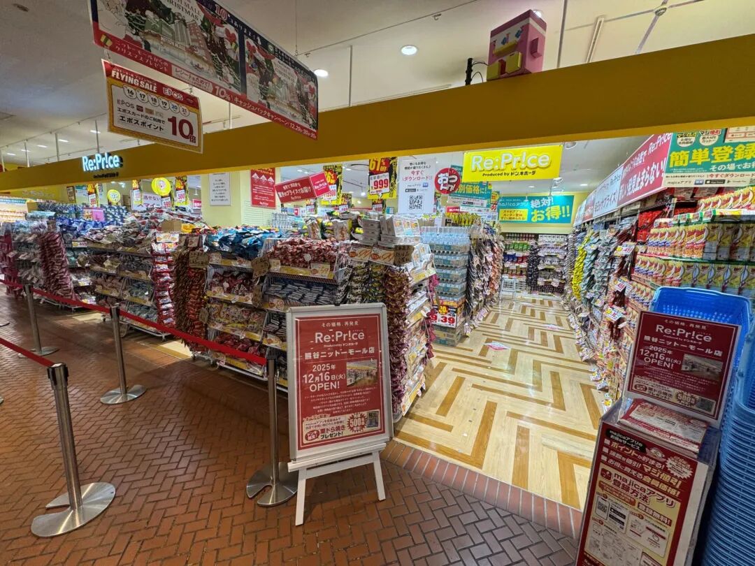 因此,唐吉訶德于2025年年底正式推出首家主打化妝品與日用品的折扣雜貨店“Re:Price”,店名意為“重新定價(jià)”。首店位于日本埼玉縣熊谷市的大型商場(chǎng)NITTOH MALL一層,距離JR及秩父鐵道熊谷站步行僅3分鐘。