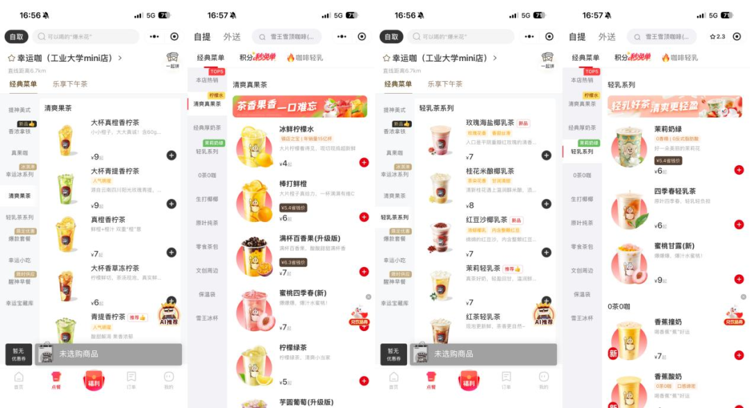 其次,產(chǎn)品和價(jià)格帶的區(qū)隔也日趨模糊。幸運(yùn)咖的主力產(chǎn)品集中在5-13元,蜜雪冰城在4-9元,存在明顯重疊。而且,幸運(yùn)咖除了咖啡,還銷(xiāo)售冰淇淋、果茶、輕乳茶等非咖啡類(lèi)飲品,直接與蜜雪冰城形成正面競(jìng)爭(zhēng)。