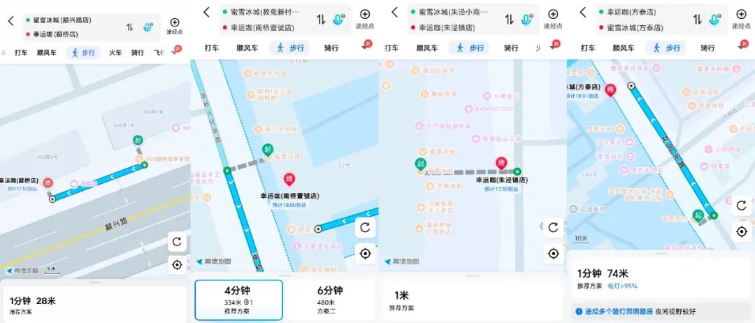 首先,在選址上,幸運(yùn)咖往往靠近蜜雪冰城,形成事實(shí)上的客流疊加和隱性競(jìng)爭(zhēng)。以上海為例,幸運(yùn)咖的17家門(mén)店中,有8家500米范圍內(nèi)存在蜜雪冰城,最近門(mén)店的直線(xiàn)距離不超過(guò)30米,占比達(dá)47.06%。