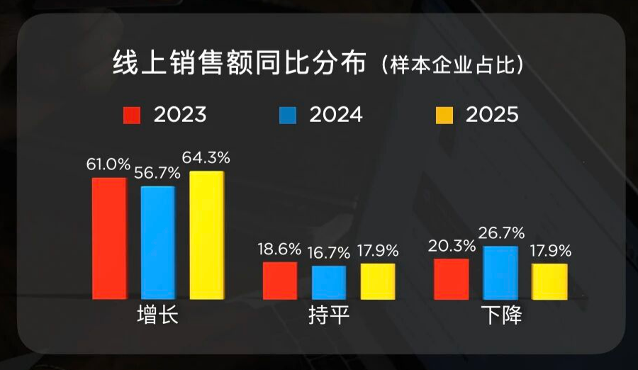2025年,線上銷售額實(shí)現(xiàn)同比增長的企業(yè)占比達(dá)64.3%,其中,增速超過10%的企業(yè)占比高達(dá)46.4%,遠(yuǎn)高于2024年的26.7%。這不是補(bǔ)充性的渠道增長,而是行業(yè)的結(jié)構(gòu)性轉(zhuǎn)變。
