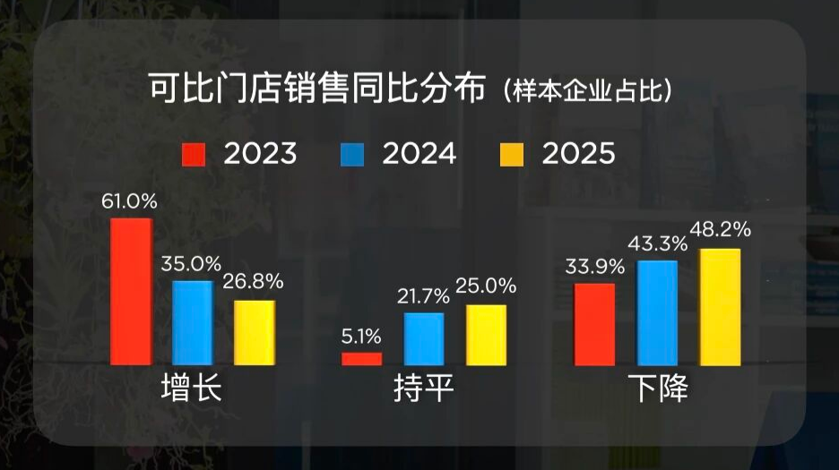 2025年,可比門店銷售實(shí)現(xiàn)增長的企業(yè)占比僅26.8%,而出現(xiàn)下滑的企業(yè)占比達(dá)48.2%,換句話說,接近半數(shù)企業(yè)在既有門店的經(jīng)營效率上出現(xiàn)了明顯壓力。