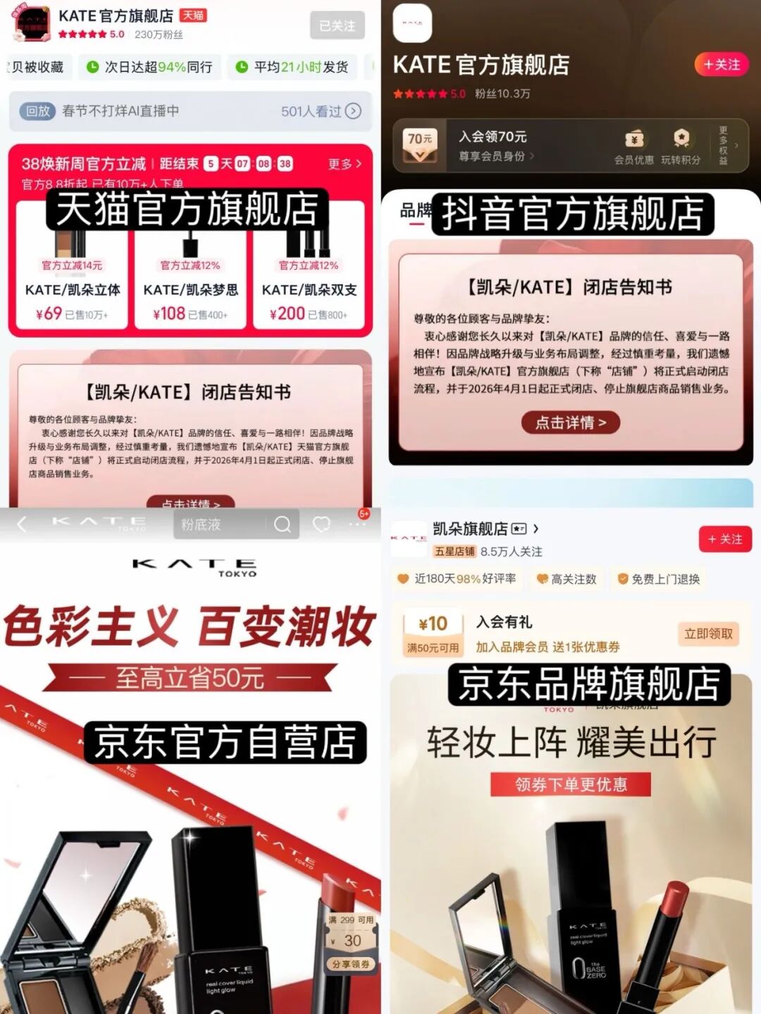 如今,繼貝玲妃全線撤店、退出主流電商之后,KATE也正式官宣閉店,一個時代的日系開架彩妝記憶就此落幕。