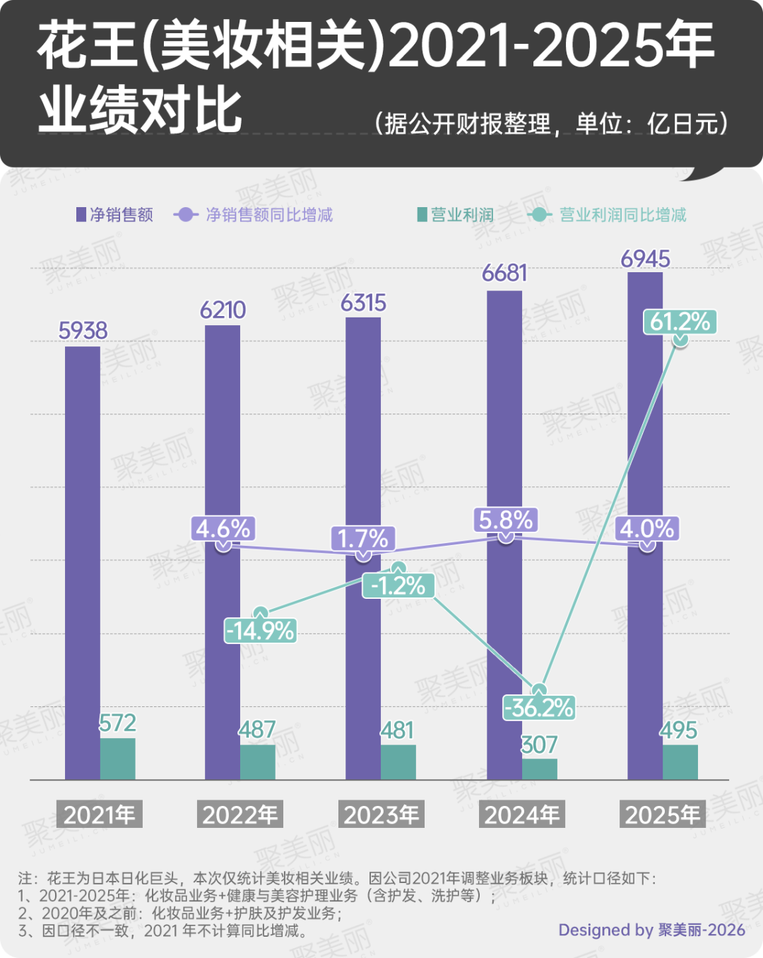 對比近5年(2021-2025年)的業(yè)績表現(xiàn)來看,花王(美妝相關(guān))的盈利能力曾一度大幅減弱。尤其是2022-2024年期間連續(xù)三年營業(yè)利潤下滑,2024年更是大幅減少36.2%。