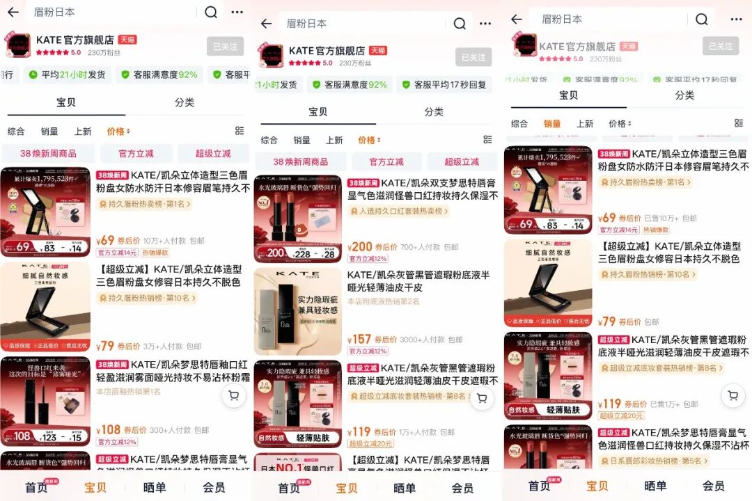 截至目前,KATE天貓官方旗艦店累計粉絲已達230W,店鋪評分5.0 。其中,三色眉粉依舊是品牌銷量冠軍,月銷10W+,穩(wěn)居天貓持久眉粉熱賣榜TOP1。