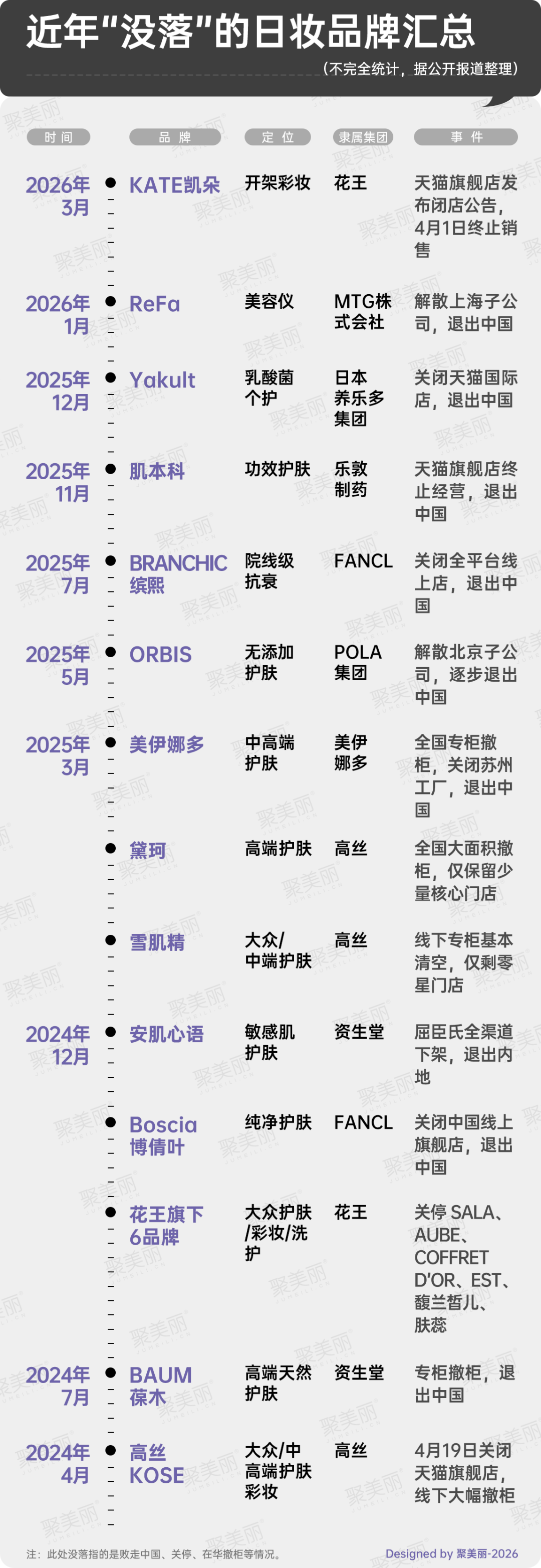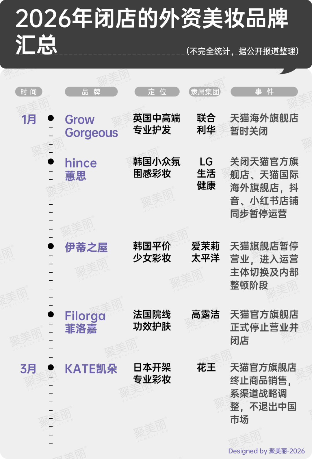 事實上,KATE的困境,正是當(dāng)下外資美妝在華遇冷的縮影。據(jù)聚美麗不完全統(tǒng)計,2026年開年至今,已有hince、菲洛嘉、伊蒂之屋、Grow Gorgeous、KATE等5個外資品牌陸續(xù)關(guān)閉中國線上旗艦店,一場外資美妝的撤退潮正在上演。
