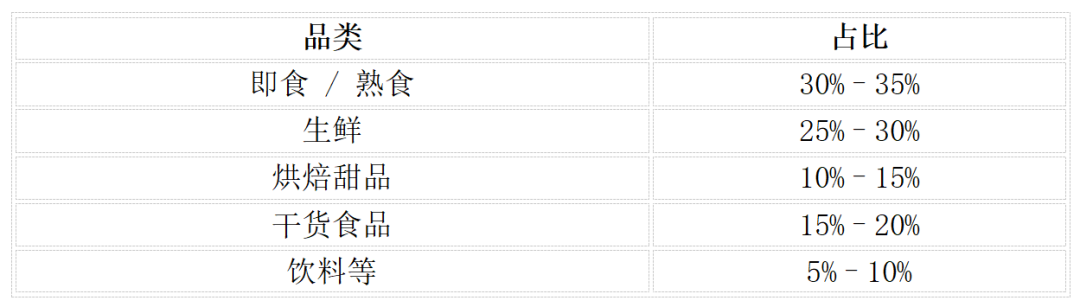 從結構上看,即食食品、熟食和烘焙甜品占據(jù)核心位置,而基礎糧油和品牌飲料等標準化商品比例較低。