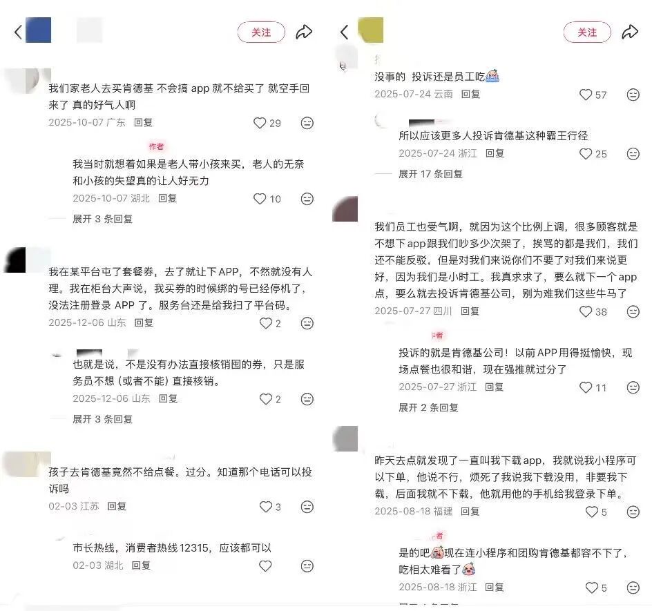 在社交平臺(tái),類(lèi)似的討論并不少見(jiàn)。一些消費(fèi)者分享過(guò)被引導(dǎo)甚至強(qiáng)制下載APP的經(jīng)歷,甚至社交平臺(tái)上有自稱(chēng)是肯德基店員的用戶直言:不用APP,肯德基就寧可不賺這一單的錢(qián)。