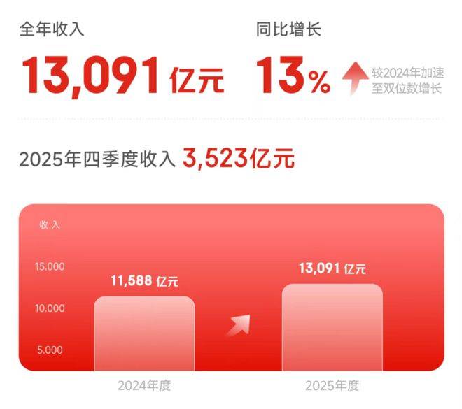 3月5日,農(nóng)歷驚蟄,京東發(fā)布2025年第四季度及全年財(cái)報(bào),2025年京東實(shí)現(xiàn)收入13091億元,同比增速?gòu)?024年的6.84%提升至12.97%。其中,京東零售2025年實(shí)現(xiàn)收入1.13萬(wàn)億元,同比增長(zhǎng)10.9%,凈利潤(rùn)514億元,同比增長(zhǎng)25%。